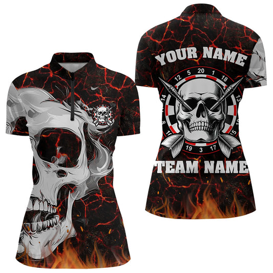 Personalisierte Rote Leuchtende Feuer Riss Totenkopf Dartshirts, gruselige Dartshirts für Damen TDM3267