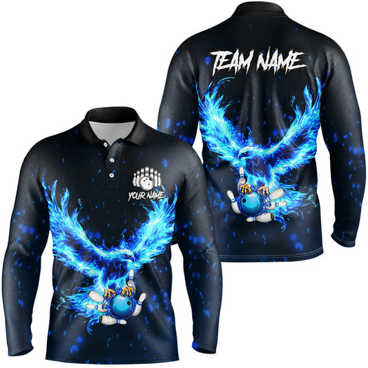 Blauer Flammenadler Maßgeschneidertes Bowling-Poloshirt, Viertelreißverschluss-Shirt für Herren, personalisierte Bowling-Team-Trikots NQS8906