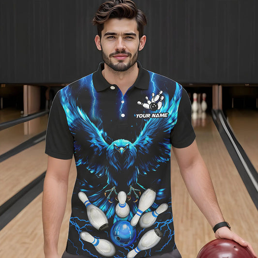 Benutzerdefiniertes Blaues Blitz-Donner-Adler Herren-Bowling-Poloshirt, Viertelreißverschluss-Shirts, Bowling-Team-Trikots, Outfits NQS9577