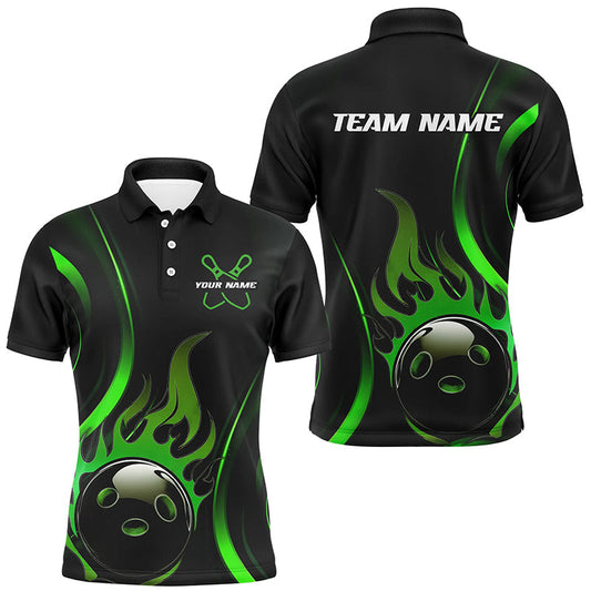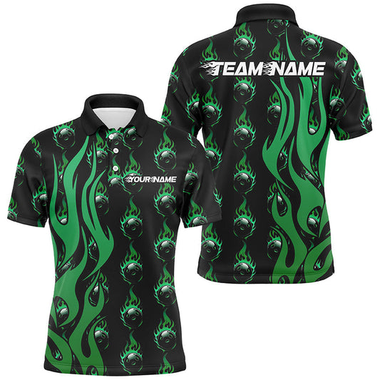 Grüne Flammen-Bowlingkugel-Bowling-Poloshirt für Herren, individuelle Bowlingtrikots mit Teamnamen IPHW6949