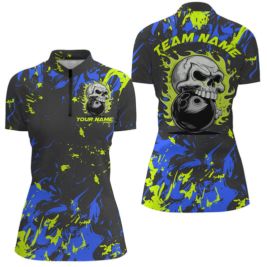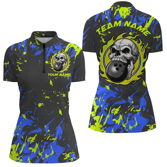 Individuelle blau-grüne Bowlingtrikots für Damen, Flammen-Schädel-Bowlingteam-Hemden IPHW6707
