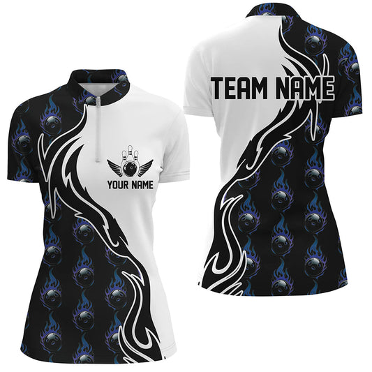 Blaues Flammen-Bowlingkugel-Polohemd für Damen, individuelle Bowlingtrikots mit Teamnamen IPHW6948