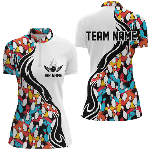 Bunte Bowling-Pins, individuelle Damen-Bowling-Polohemden, Flammen-Bowling-Outfits für Bowler IPHW6951