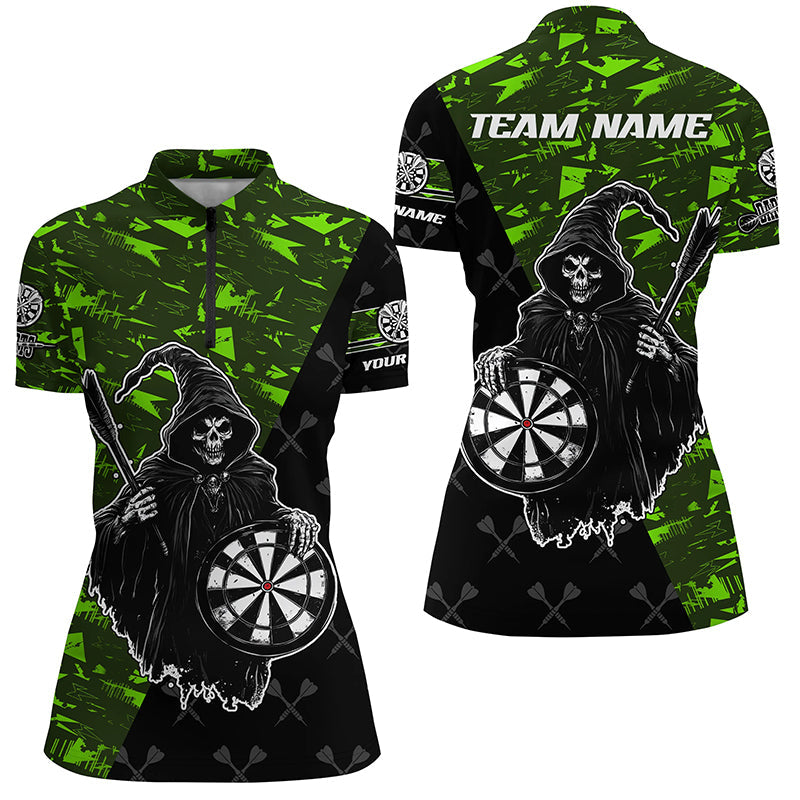 Individuelles Grünes Abstraktes Todes-Skelett Damen Quarter Zip Shirt, Lustiges Dart Team Trikot TDM2607