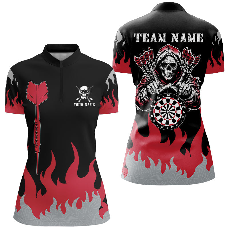 Individuelles Dart Pfeil und Flammenmuster Dart Damen Quarter Zip Shirt, Gruseliges Skelett Dart Trikot TDM2884