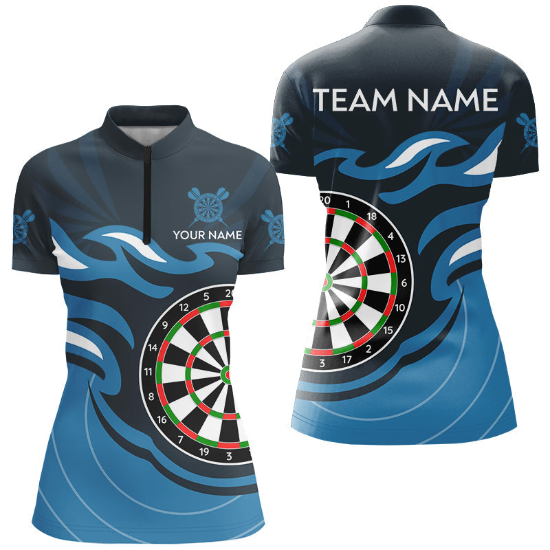 Individuelles Blaues Dartboard Flamme Dart Quarter Zip Shirt Für Damen, Dart Trikot Team Uniform TDM3051